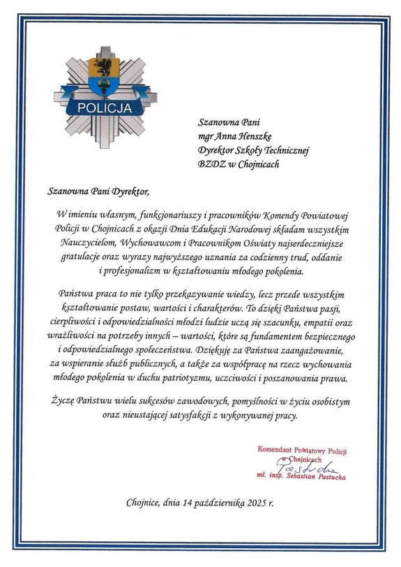 Z okazji Dnia Edukacji Narodowej komendant powiatowy policji w Chojnicach mł. insp. Sebastian Pastucha złożył na ręce dyrektor Szkoły Technicznej BZDZ w Chojnicach mgr Anny Henszke życzenia dla wszystkich nauczycieli, wychowawców i pracowników oświaty.