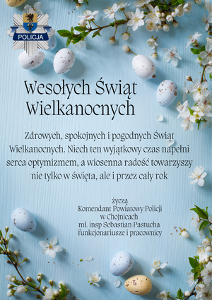 Komendant Powiatowy Policji w Chojnicach mł. insp. Sebastian Pastucha w imieniu własnym oraz całego Kierownictwa życzy wszystkim policjantom, pracownikom cywilnym, instytucjom na co dzień współpracującym z chojnicką Policją oraz mieszkańcom powiatu zdrowych i spokojnych Świąt Wielkanocnych.