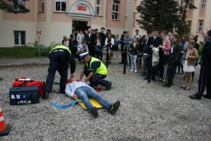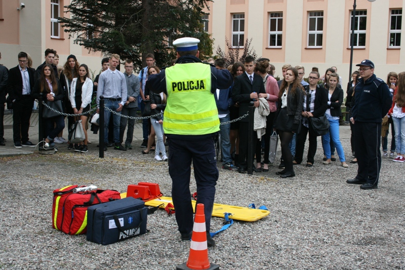 Uczniowie z zainteresowaniem obejrzeli też pokaz ratownictwa medycznego przygotowany przez funkcjonariuszy ruchu drogowego. Sierżant Łukasz Mazur objaśnił, jakim sprzętem dysponują policjanci, pełniący służbę na drodze oraz jak należy się zachować w sytuacji wypadku drogowego bądź kolizji.
